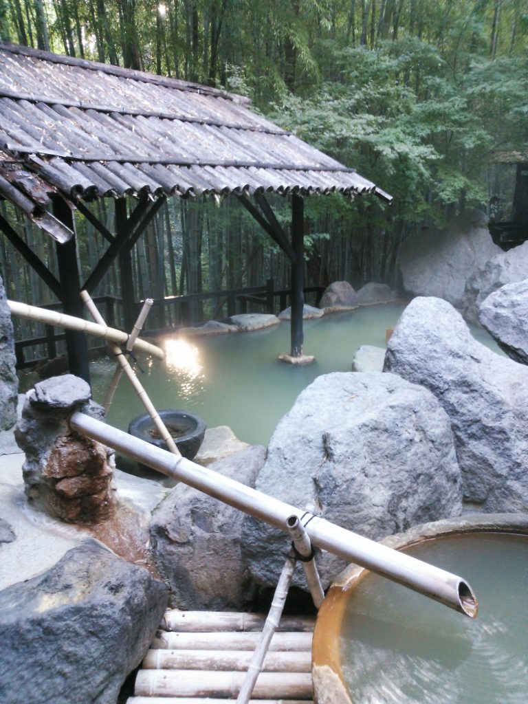 広すぎる石の温泉にライトアップされた竹と、にごり湯がまた幻想的な感じで気持ちいい~2人では贅沢すぎます。